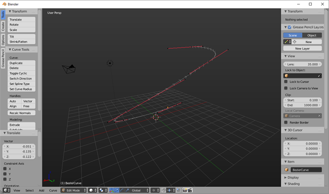 作成したBezierパスは最低限の線分のみですので、必要な場合はToolsのExtrudeで伸ばしてください。