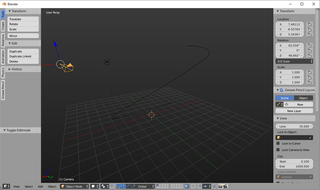 次に、カメラの座標がずれているとパスへの追従が確認できませんので、カメラを選択して『Location』と『Rotation』を0に設定してください。