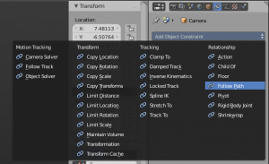 パスを作成すれば次にカメラを選択し『Constraint』『Follow Path』を選びます。