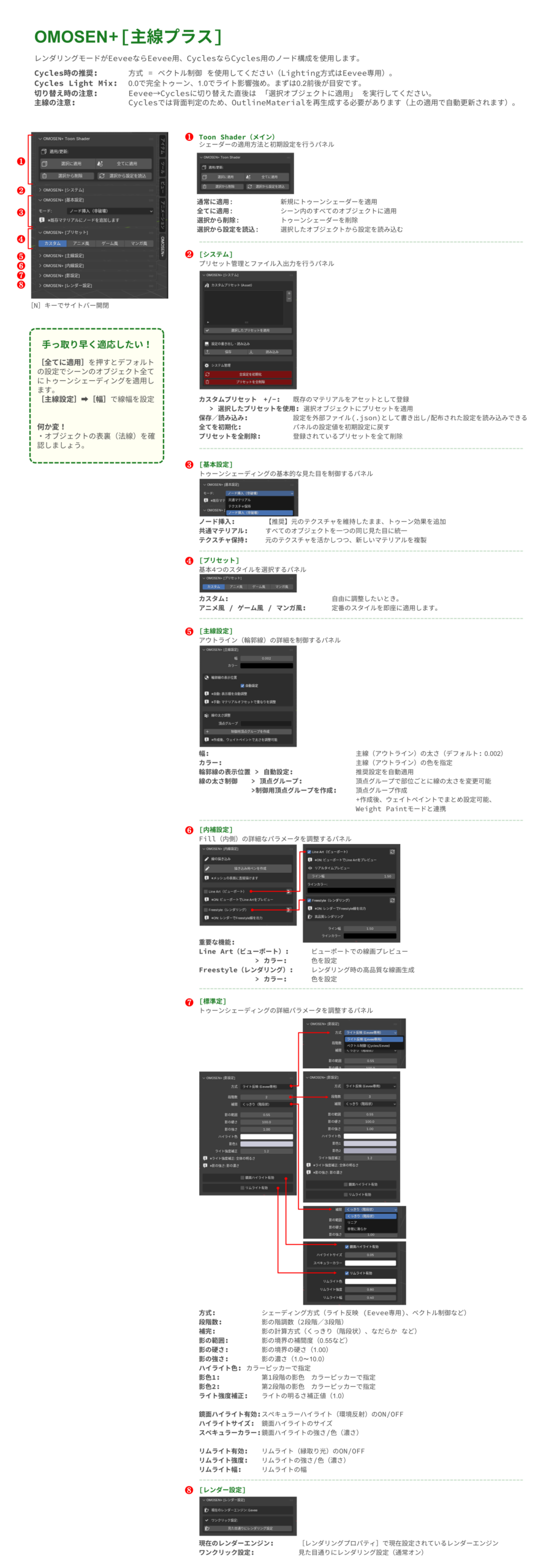 - Cycles Light Mix: 0.0で完全トゥーン、1.0でライト影響強め。まずは0.2前後が目安です。