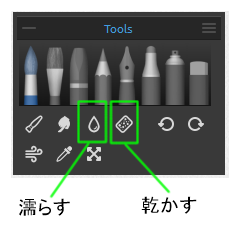 水彩というイメージを非常に意識しているために、『濡らす』『乾かす』といった概念がしっかりとしていてツールとしても用意されています。