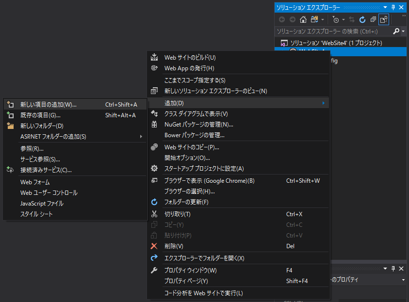 ソリューション エクスプローラーに新規のWebサイトが出来ますので、マウス右プレスで追加 > 新しい項目の追加を選んで『新しい項目の追加』ウィンドウを表示します。