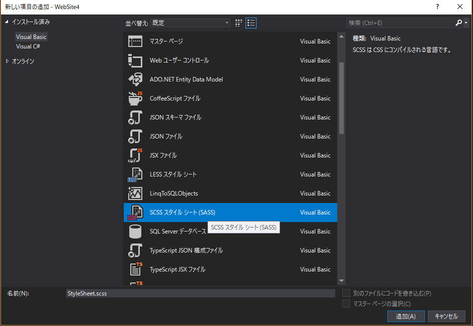 『新しい項目の追加』ウィンドウで、SCSSスタイルシート(SASS)を選んでスタイルシートファイルを作成します。