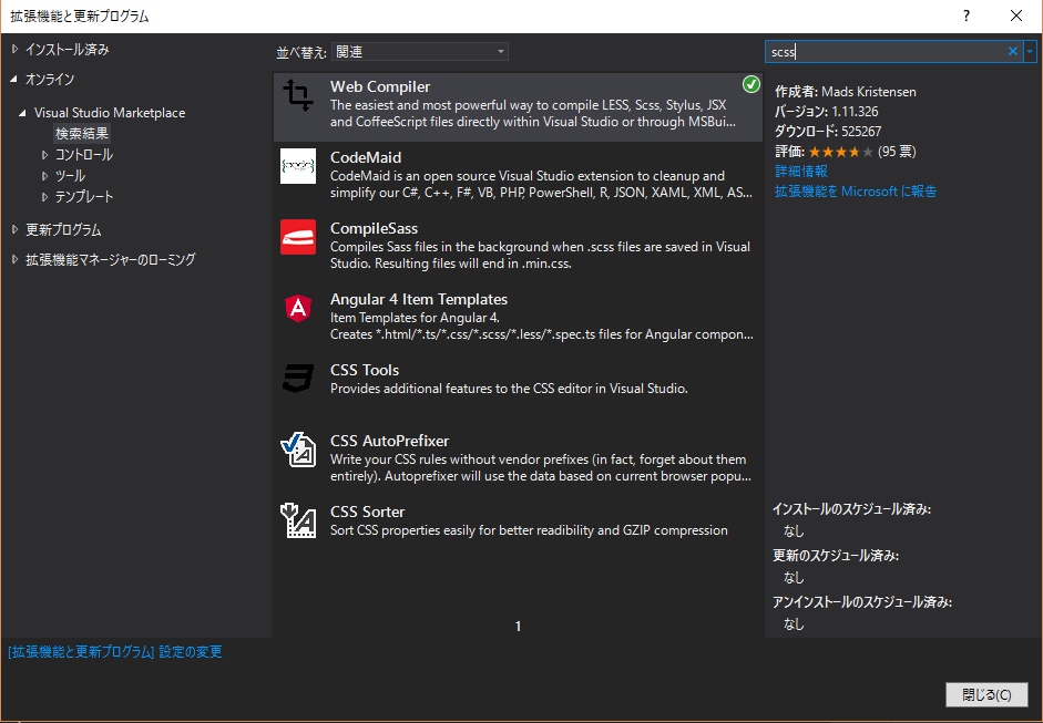 ここではSASSと入力し、Web Compilerが表示されましたので目的の拡張機能を選んでインストールを行います。