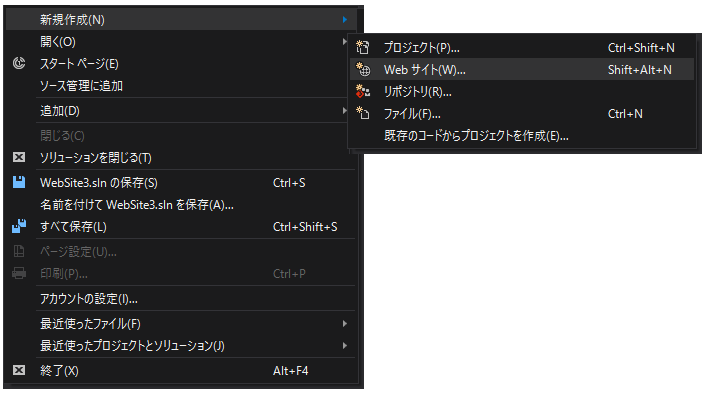 メニュー > ファイル > 新規作成 > Webサイトを選んで新規のWebサイトを作成します。