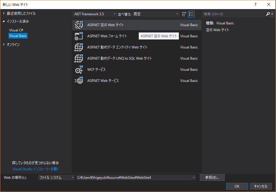 『新しいWebサイト』ウィンドウが表示されますので、Visual Basic ⇒ ASP.NET 空のWebサイトを選びます。