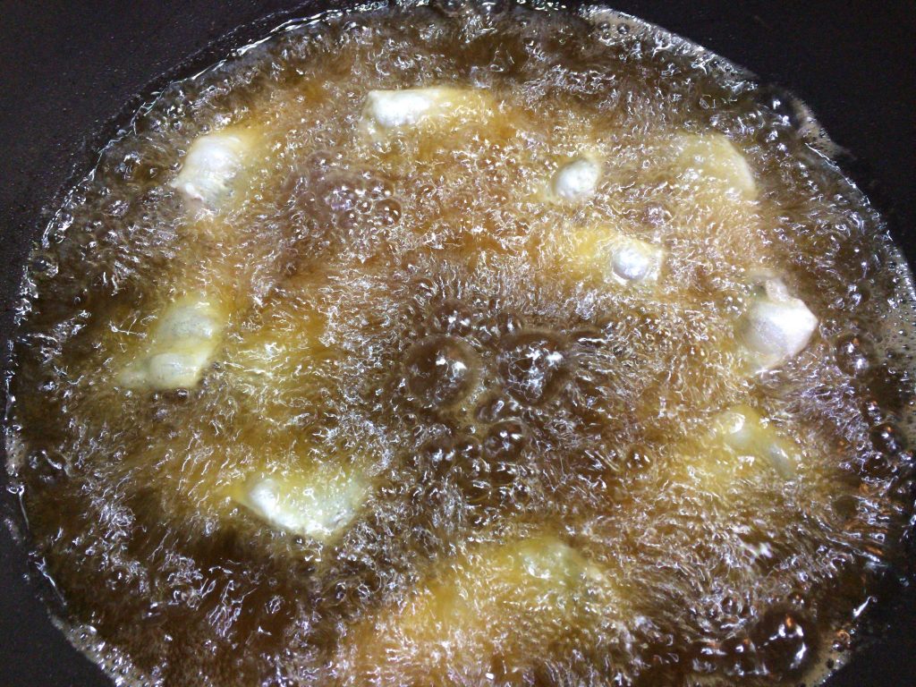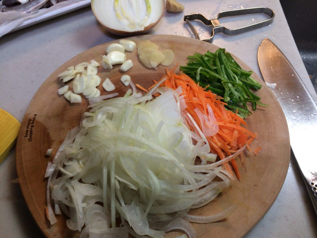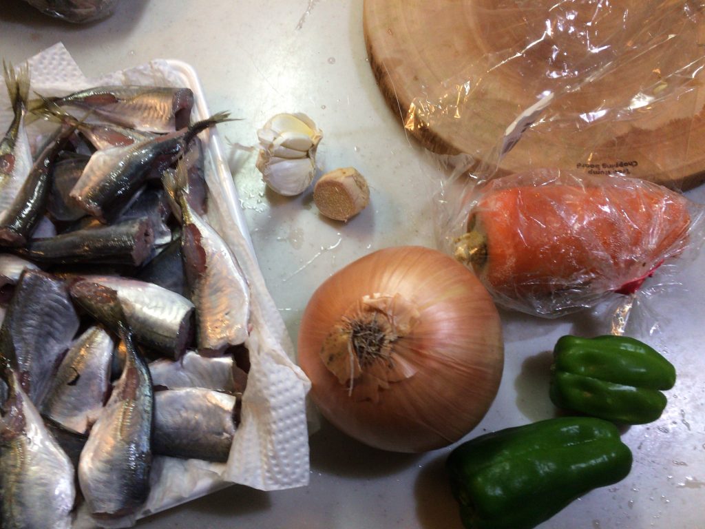 | — 材料 — アジ×20程度、玉ねぎ、人参、ピーマン、にんにく、しょうが、鷹の爪、片栗粉、メリケン粉 — だし汁— 水、酢、砂糖、醤油、かつおだし、みりん、しお/コショウ |