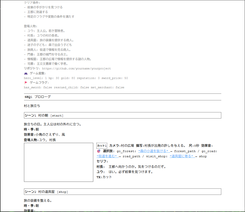 以下は本フォーマットをAI(Claude)に読ませて、短いシナリオを書かせた例