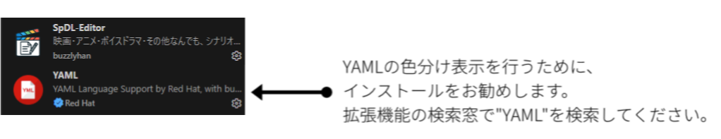 「SpDL (Screenplay) Editor」 は「 YAML Language Support by Red Hat」のYAMLインデント・構文エラーの検出機能を前提としています。